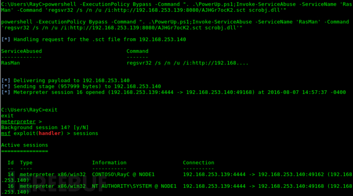 PowerUp脚本已经识别出了 RasMan服务的弱权限问题。这样一来攻击者就可以用他的payload来重新配置服务然后重启服务,并利用重启后获取的最高(SYSTEM)权限来执行所需的命令。我们可以使用命令Invoke-ServiceAbuse来完成以上操作,如图5所示。